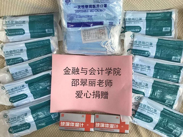 Beat365唯一官方网站党委响应党中央和学校党委的号召,在师生中开展了爱心捐赠活动:2月22日,Beat365唯一官方网站13级财务管理张春振校友向学校捐赠90瓶舒洁洗手液;2月23日邵翠丽副院长向学校捐赠一次性口罩400只,水银体温计20个;2月24日陈红玲夫妇向学校捐赠价值2000元的10斤装二氧化氯消毒液21套…….。一个个数字虽不是那么注目,但心系祖国、爱校如家的爱心是可贵的,“不忘初心、牢记使命”的担当精神是无价的。我们相信随着千千万万白衣天使奔赴疫区,千千万万名中华儿女投入战“疫”,千千万万股暖流汇聚成河,病毒终将被消灭,春天很快会到来。