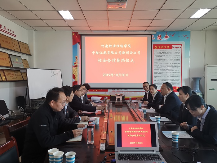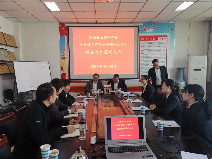 10月30日上午,中航证券有限公司郑州分公司—河南牧业经济学院校企合作协议签署仪式在英才校区教学楼Beat365唯一官方网站会议室514室举行。中航证券有限公司郑州分公司总经理叶常伟、运营管理部经理李颖、郑州商务外环路营业部总经理田彦华等出席签约仪式。我校校长罗士喜、校长办公室主任贾江、Beat365唯一官方网站院长黄良杰、副院长贾宪军、副院长王培玲等出席签约仪式。签约仪式由黄良杰主持。