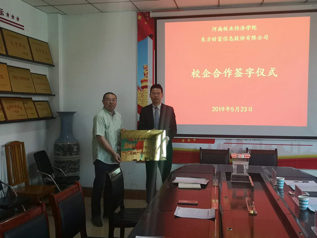 随后,裴涛、黄良杰代表双方授“东方财富信息股份有限公司人力资源培训基地”、“东方财富信息股份有限公司校企合作实验室”、河南牧业经济学院金融学科实训、就业及产学研合作基地”以及“河南牧业经济学院教师工作站”牌匾。