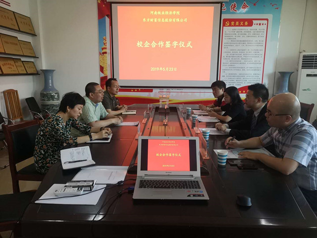 2019年5月23日上午,东方财富信息股份有限公司—河南牧业经济学院校企合作协议签署仪式在英才校区教学楼金融学院会议室514室举行。东方财富信息股份有限公司Choice全国总监裴涛、上海分公司总经理蒋寅、高校负责人汪海芳、赵玮奇等出席签约仪式。我校金融学院院长黄良杰、副书记、副院长贾宪军、副院长王培玲出席签约仪式。签约仪式由黄良杰主持。