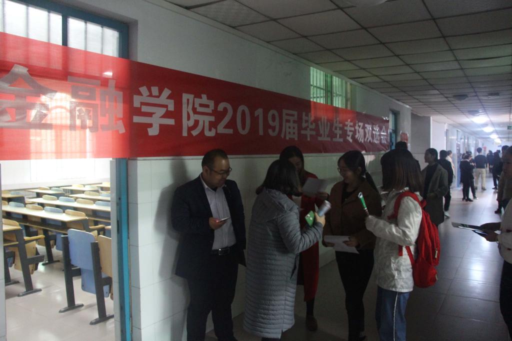 为更好地促进2019届毕业生顺利就业,进一步加强与用人单位之间的联系,积极搭建毕业生与用人单位之间的沟通交流平台,11月15日,金融学院2019届毕业生专场校园双选会在教学楼B座教室如期举行。来自中国人寿、太平洋保险、中国平安、广东德律信用管理股份有限公司、北京中方信富投资管理咨询有限公司、宜信普惠、河南沃金区块链科技有限公司、河南金汇典当、郑州易聚金融等30余家省内外用人单位到场选拔优秀毕业生。