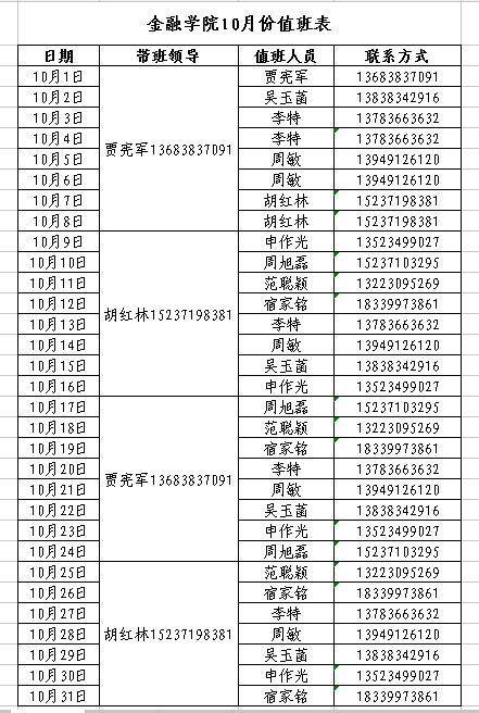 金融学院10月份值班表