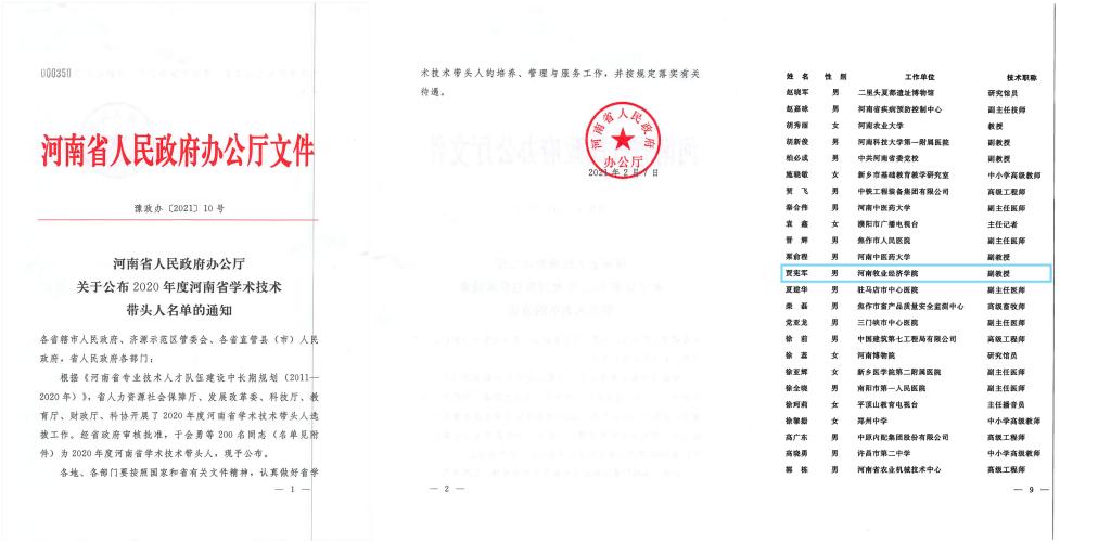 近日,河南省人民政府办公厅发布了豫政办〔2021〕10号文件,正式公布了2020年度“河南省学术技术带头人”名单,Beat365官网副院长贾宪军博士荣获“2020年度河南省学术技术带头人”荣誉称号。