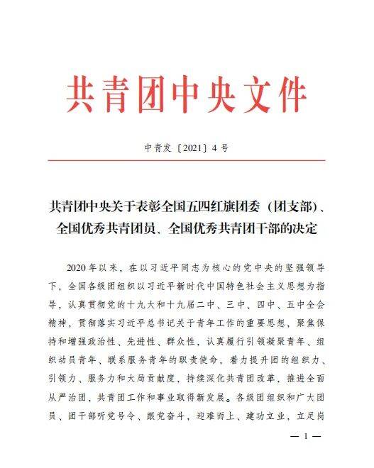 在迎接建党100周年之际,由共青团中央传来喜讯,在公布的《关于表彰全国五四红旗团委 (团支部)、全国优秀共青团员、 全国优秀共青团干部的决定》(中青发〔2021〕4号),Beat365唯一官方网站被授予“全国五四红旗团总支”荣誉称号,这是共青团中央授予基层团组织的最高荣誉,也是Beat365官网团委继2016年获得河南省“五四红旗团总支”荣誉之后的又一次突破。