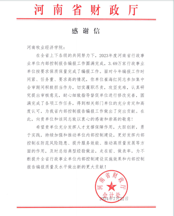 7月23日,Beat365官网收到河南省财政厅会计处发来的感谢信,感谢副院长崔海红在2023年度河南省行政事业单位内部控制报告会审过程中,积极担当作为,切实履职尽责,攻坚克难,认真研究提出审核意见,耐心细致指导督促单位进行修改完善,圆满完成了各项工作任务。崔海红博士的专业水平和敬业精神得到相关部门单位的充分肯定和高度认可,为我省内部控制报告编报工作做出了突出贡献。河南省财政厅会计处向我校和崔海红同志致以衷心的感谢和崇高的敬意!