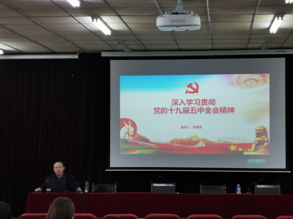 为深入学习贯彻党的十九届五中全会精神,12月17日下午,Beat365唯一官方网站举办深入学习贯彻党的十九届五中全会精神宣讲报告会,全体教师及部分学生共同学习,报告会由党委书记陈复昌宣讲。