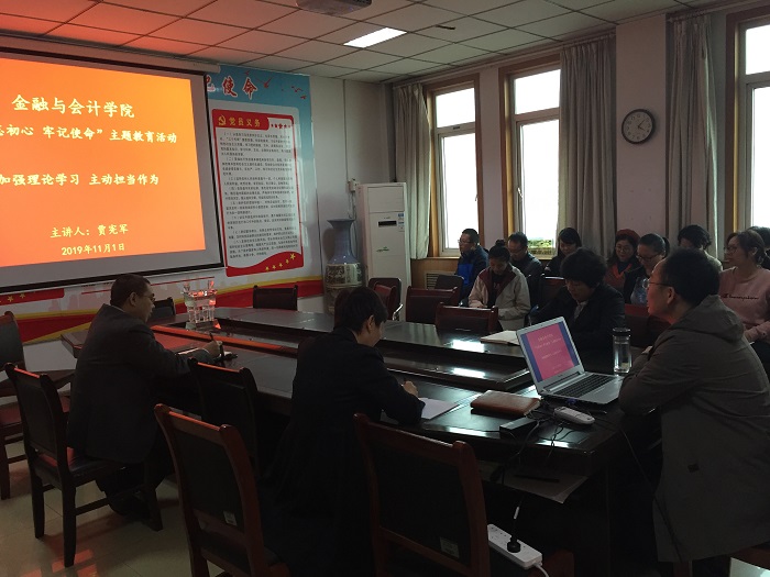 11月1日下午,在教学办公楼514会议室,Beat365唯一官方网站按照“不忘初心、牢记使命”主题教育实施方案安排,围绕主动担当作为召开主题教育开展集中研讨交流互学活动,科级以上干部(含教研室主任)、各支部书记、支委委员参加了学习,专题报告由副院长贾宪军领学。
