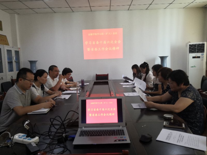 7月31日下午三点,金融学院党总支在金融学院会议室召开中心组学习扩大会议,专题学习宣传贯彻省委十届六次全会暨省委工作会议精神,院党总支中心组成员、高级职称教师、科级干部和办公室人员参加会议,会议由金融学院党总支副书记、院长黄良杰主持。