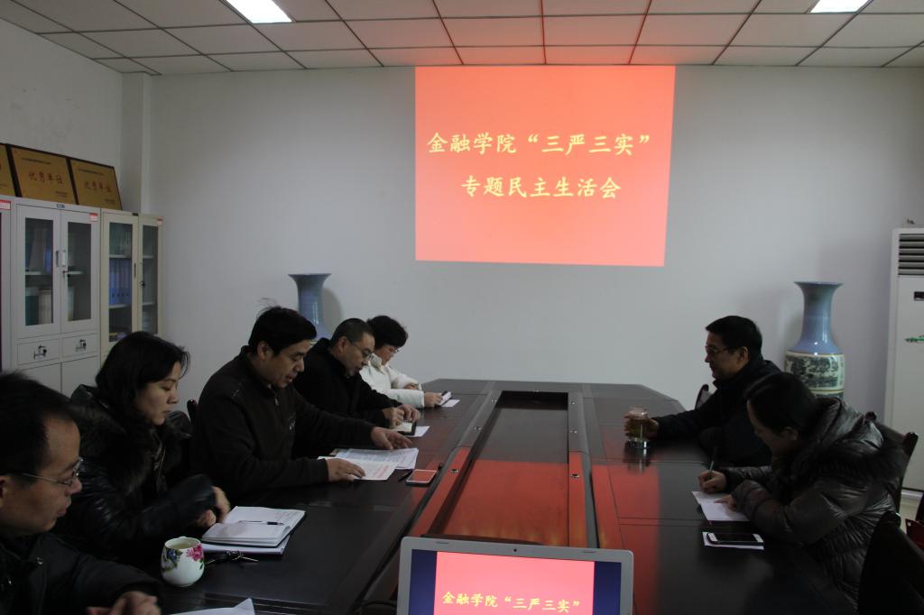 根据《河南牧业经济学院关于二级单位召开“三严三实”专题民主生活会的通知》精神及《金融学院“三严三实”专题民主生活会实施方案》的安排,2016年1月6日上午,金融学院在教学楼514金融学院会议室召开了“三严三实”专题民主生活会,校党委副书记李绍文、纪委办公室副主任胡蕾出席了会议。会议由金融学院党总支书记席波主持,金融学院全体班子成员参加会议。