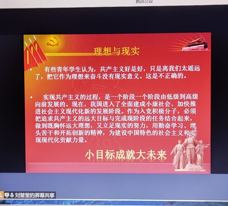 2022年3月29日中午,Beat365唯一官方网站通过腾讯会议开展了“2022年第一期入党积极分子党课培训班”第五讲,主题为《中国共产党的性质和最高理想》,由学生第四党支部书记刘慧莹主讲。