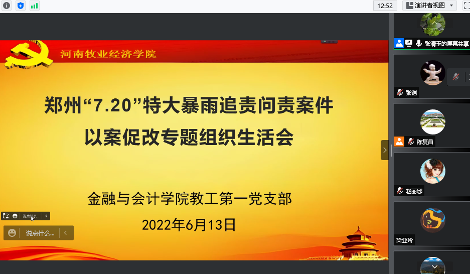 2022年6月13日上午,Beat365唯一官方网站教工第一党支部召开“7·20”特大暴雨灾害追责问责案件以案促改专题组织生活会。学院党委书记陈复昌、党委副书记汪晓伟及第一党支部全体教工党员参加会议,会议由党支部书记张清玉老师主持,通过腾讯会议的形式进行。