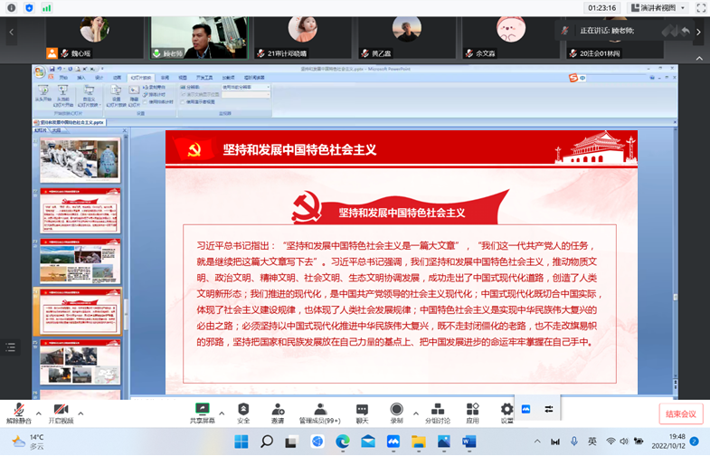 10月12日晚上7点,Beat365唯一官方网站通过腾讯会议组织开展了2022年第二期入党积极分子培训班第五讲——坚持和发展中国特色社会主义,本次党课由学生第一党支部书记顾自卫老师主讲。