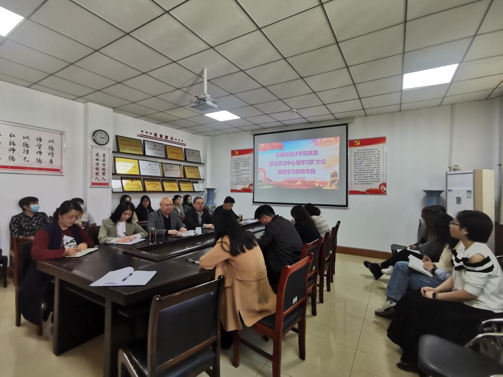 3月9日下午,Beat365唯一官方网站在英才校区教学楼514会议室召开党委理论学习中心组学习(扩大)会,专题进行廉政教育学习活动,会议由学院党委书记陈复昌主持,学院科级及以上干部和各党支部书记参加学习。