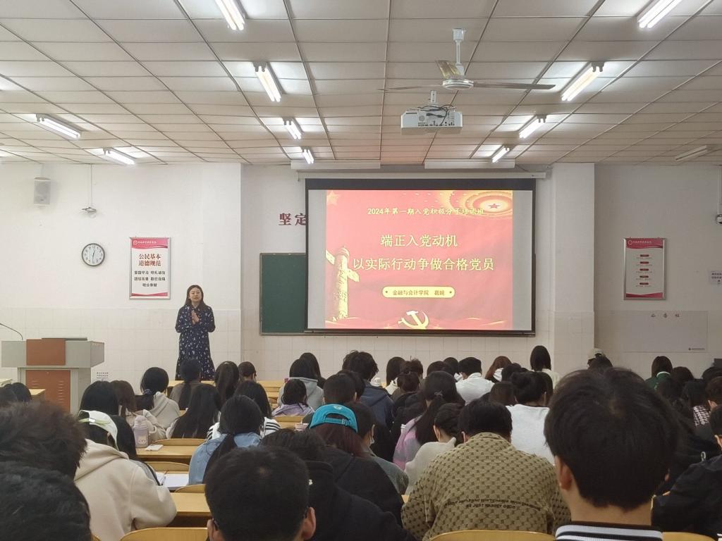 葛婉老师主要从入党程序及其注意事项和端正入党动机争做合格党员两方面进行讲述。第一部分,葛老师首先详细讲述了申请入党的条件、入党积极分子的确定和培养、发展对象的确定和考察、预备党员的接收、预备党员的教育考察和转正五大方面的内容,使大家对大学生入党的流程有了进一步的了解;接着讲述了入党申请书、入党志愿书、思想汇报等内容的写作注意事项,使大家了解了入党相关材料的写作要求。葛老师希望同学们将入党程序了熟于心,遵守党规党纪,增强对中国共产党的热爱,并端正入党动机。