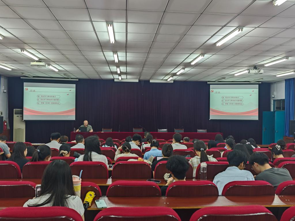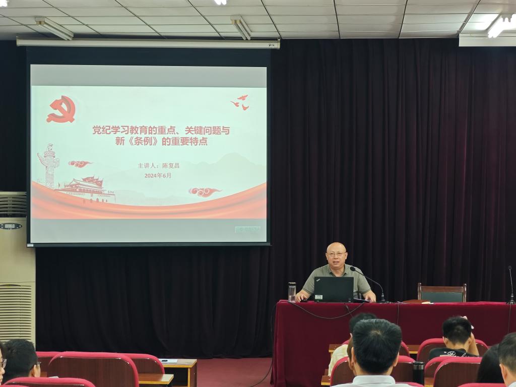 6月21日上午,Beat365唯一官方网站党委书记陈复昌以“党纪学习教育的重点、关键问题与《条例》的重要特点”为题,在英才校区综合实验楼E109会议室为学院师生党员讲授党纪学习教育专题党课。