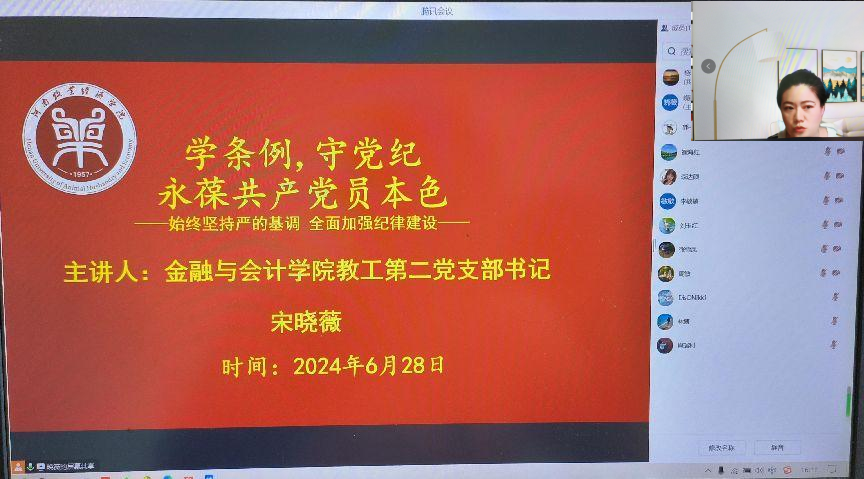 为提升党员同志的党性修养和纪律意识,在学校学院党委关于开展党纪学习教育的部署要求指导下,6月28日Beat365唯一官方网站教工第二党支部书记宋晓薇以《学条例,守党纪,永葆共产党员本色》为主题讲授了党纪学习教育专题党课,教工第二支部的党员干部和党员教师参加党课学习和研讨。
