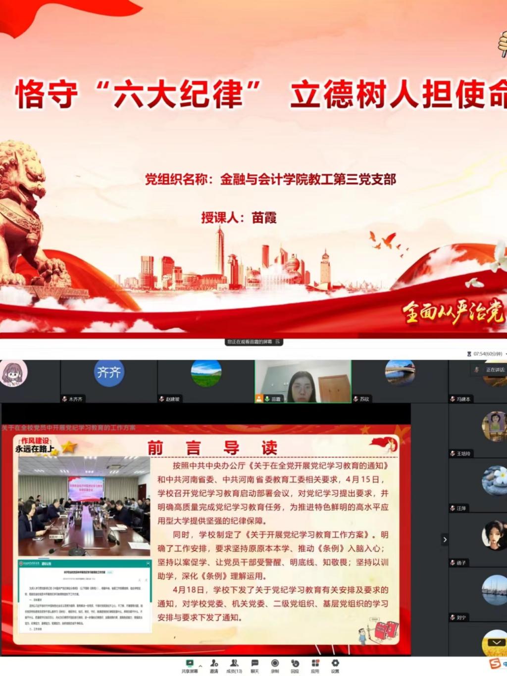 为进一步强化党纪学习教育效果,推动党纪学习教育走深走实,强化支部党员教师纪律意识,为学校事业高质量发展提供坚强纪律保障,2024年6月28日上午,Beat365唯一官方网站教工第三党支部书记苗霞同志以“恪守六大纪律、立德树人担使命”为主题开展党课活动,支部全体党员教师参加了学习与研讨。