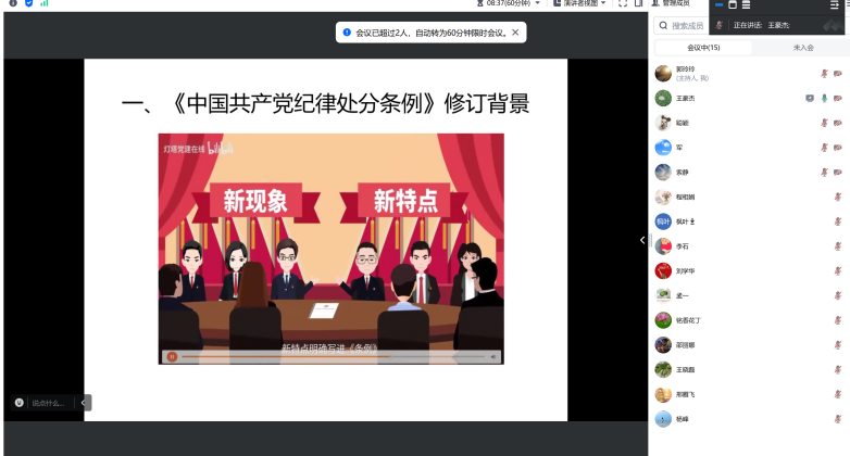 支部书记王豪杰在本次党课中依次阐明了为什么要开展党纪学习教育、党纪学习教育应该学习什么和如何有效开展党纪学习教育等问题。王豪杰指出全面从严治党是新时代党的建设的鲜明主题,党纪学习教育是对新时代全面从严治党战略部署的积极响应和坚决贯彻,支部党员要不断把全面从严治党的理论和实践有机结合起来,认真做到学会学精、知行合一。