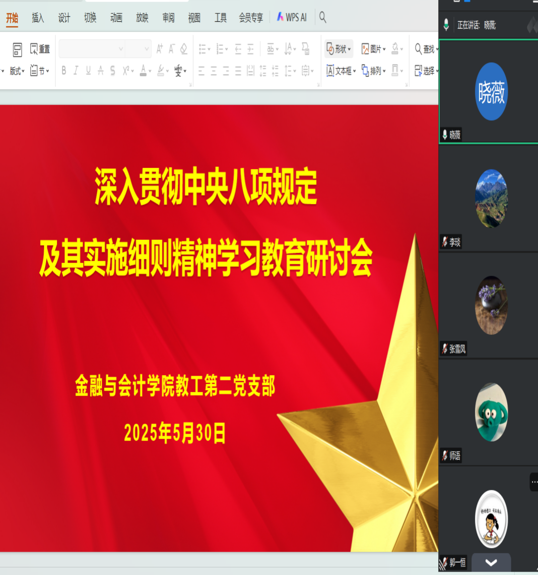 为深入贯彻落实党中央决策部署,深化作风建设,Beat365唯一官方网站教工第二党支部于5月30日组织开展深入贯彻中央八项规定及其实施细则精神学习教育研讨会,本次会议由党支部书记宋晓薇主持,教工二支部党员参加了会议。