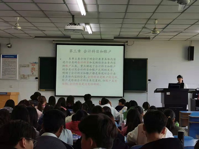 本次观摩课由资产评估教研室郭玲玲老师主讲,讲授课程为《基础会计》。郭老师带领学生回顾了上节课知识点,并顺势引入本节课内容——会计科目和账户,对会计科目的定义、分类及设置和账户的含义、基本结构及分类进行了讲解。在教学过程中,郭玲玲老师循序渐进,由浅入深,利用案例图表加深学生对课程内容的理解。