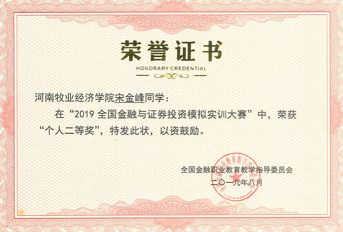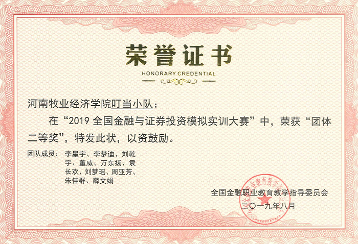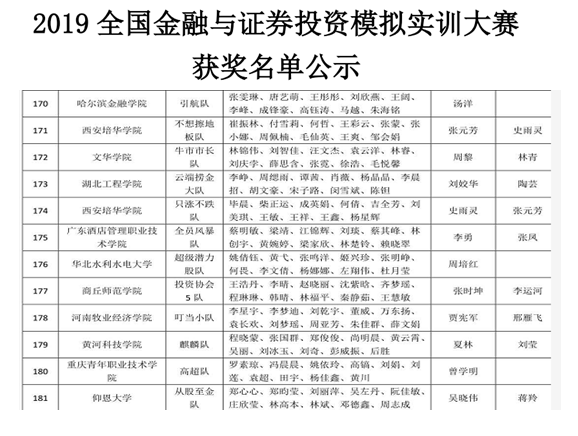 2019年5月,金融学院受邀参加了2019年全国金融与证券投资模拟实训大赛,此次大赛在全国金融职教委的指导下,由中国量化投资研究院主办,深圳国泰安承办,中山大学、厦门大学等三百多所高校参加了比赛。为了迎战此次大赛,院领导十分重视,由副书记兼副院长贾宪军带队,选拔出60名学生及9名教师,组成6个团队参赛。自5月初以来,经过一个半月的激烈角逐,Beat365官网由贾宪军和邢雁飞老师指导的叮当小队在来自全国高校的3387个团队中排名178名,荣获“全国团体二等奖”,此外李小典和索静老师指导的团队成员宋金峰同学荣获“个人二等奖”,万东扬、介钊阳、韩宗浩三名同学荣获“个人三等奖”。