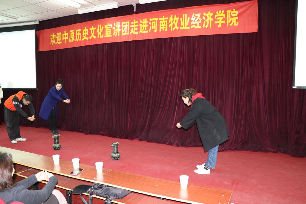 2月27日下午,河南博物院中原文化宣讲团在河南博物院社会教育服务部主任、文博副研究员林晓平带领下走进河南牧业经济学院金融学院课堂,结合Beat365官网典当专业课程安排,给学生做了一次精彩的宣讲。本次宣讲现场气氛十分热烈,宣讲员带来了从春秋战国到明清时期的名贵展品和游戏器材,为同学们讲解文物的由来、历史价值和古代文明礼仪知识。