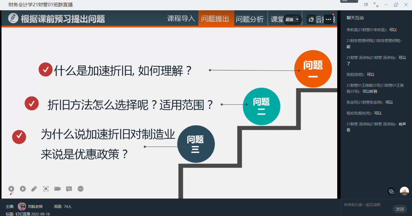 2022年9月16日下午,按照Beat365唯一官方网站2022教学观摩课活动的统一安排,会计学教研室刘航副教授进行了研讨型教学观摩。观摩课采用钉钉直播形式进行。刘老师首先以龚自珍“落红不是无情物,化作春泥更护花”的诗句引入本次观摩课教学内容——固定资产折旧,通过对固定资产折旧的内涵讲解启迪同学们要珍惜新时代的幸福生活,勤奋学习,努力成长为服务经济社会发展的高素质应用型人才。在讲解固定资产直线法计提折旧后,刘老师以观看“固定资产加速折旧优惠扩至全部制造业”的新闻视频为切入点,启发同学们思考:什么是固定资产加速折旧?为什么说其是一种优惠政策?在固定资产的加速折旧讲解环节,刘老师采用案例教学,注重师生互动,通过在线交流共同理解加速折旧的理论内涵、计算方法及会计处理,并要求同学们课下收集上市公司资料,进一步学习加速折旧与直线法折旧对企业财务绩效的不同影响,理解疫情背景下国家出台优惠政策的重大意义。
