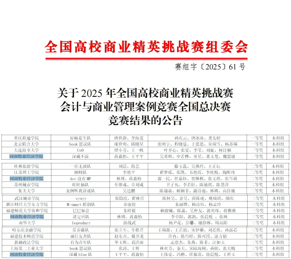 近日,2025年全国高校商业精英挑战赛会计与商业管理案例竞赛全国总决赛落下帷幕,经过激烈角逐,Beat365官网学子共斩获国家级一等奖1项,二等奖1项,三等奖2项。