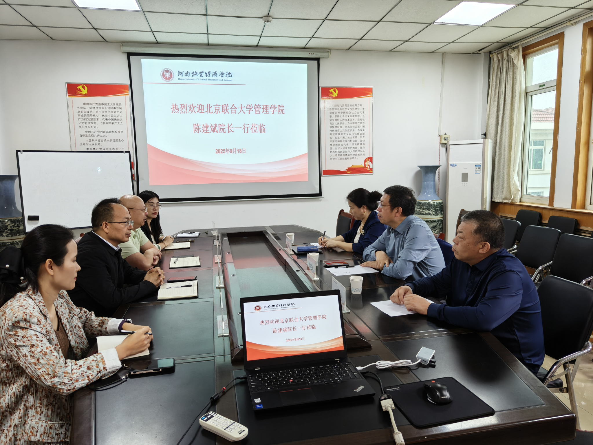 9月18日,北京联合大学管理学院院长陈建斌、财务管理系主任尹夏楠、科技与研究生培养办公室副主任任旭刚一行3人莅临Beat365官网,围绕研究生招生、学科建设、校际合作等议题展开深入交流。金融会计学院党委书记陈复昌、院长贾宪军、相关专业教研室主任陪同调研并参与座谈。