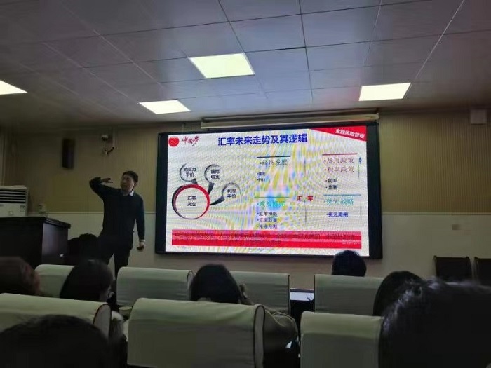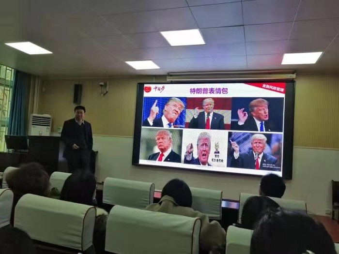 胡宏兵教授从中美贸易摩擦、全球经济形势、中等收入陷阱、供给侧改革、金融风险管理等方面,阐述了在中美贸易摩擦大背景下,中美历次经济谈判过程对全球经济、股市、大宗商品、黄金走势的影响。面对美国关税大棒,我国的应对措施及面临的压力和下一步经济走势。胡教授报告,深入浅出,妙语连珠,台下师生积极互动,掌声不断。开拓了学生的金融视野,提高了学习专业的兴趣。