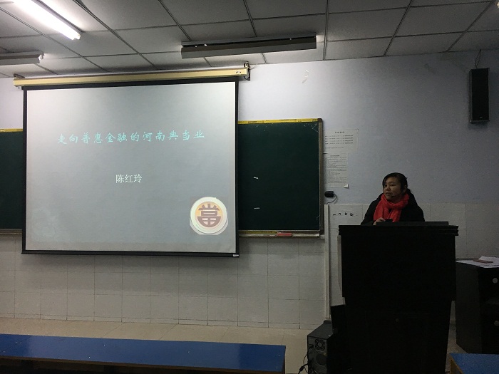 本学期金融学院继续开展院内教师系列讲座活动,为充分调动学生对专业知识学习的积极性,加强学生对金融市场相关知识的了解与典当行业的认知,于12月14日下午,在教学楼E102为Beat365官网15、17级典当班学生开展“走向普惠金融的河南典当业”的专题讲座,主讲人为Beat365官网陈红玲副教授。书记胡红林、贾宪军及部分教师出席并认真听取了本次讲座。本次讲座由贾宪军书记主持。