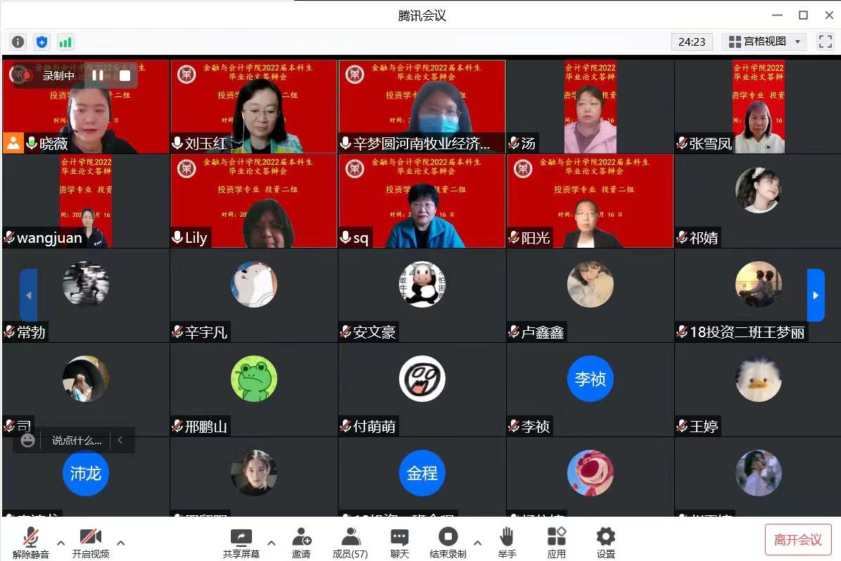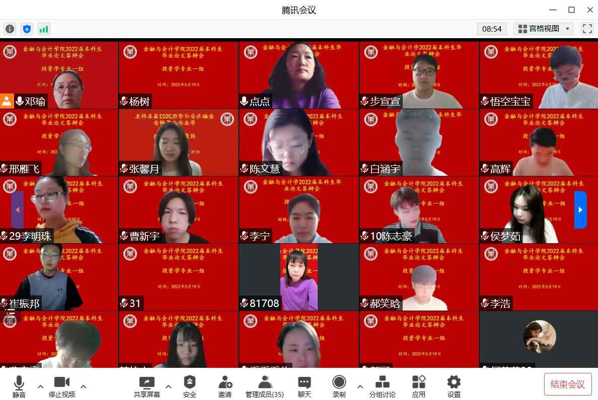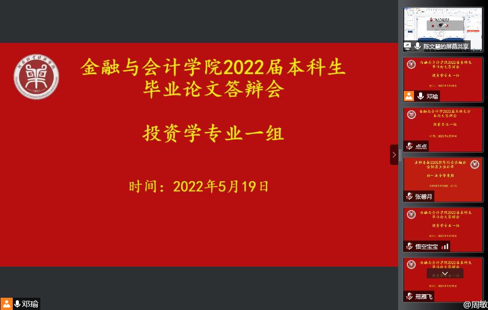 2022年5月16-19日,根据疫情防控工作相关要求,Beat365唯一官方网站投资学专业通过腾讯会议组织了2022届本科生毕业论文(设计)第一次线上答辩。