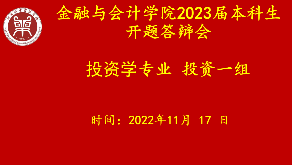 根据《河南牧业经济学院本科毕业论文(设计)工作条例》和《Beat365唯一官方网站2023届本科毕业论文工作实施方案》的要求,Beat365官网2023届投资学本科专业毕业论文开题答辩工作,于11月17日通过腾讯会议线上顺利进行,本次答辩分为2个答辩组,共99名学生、12名指导教师参与答辩会。