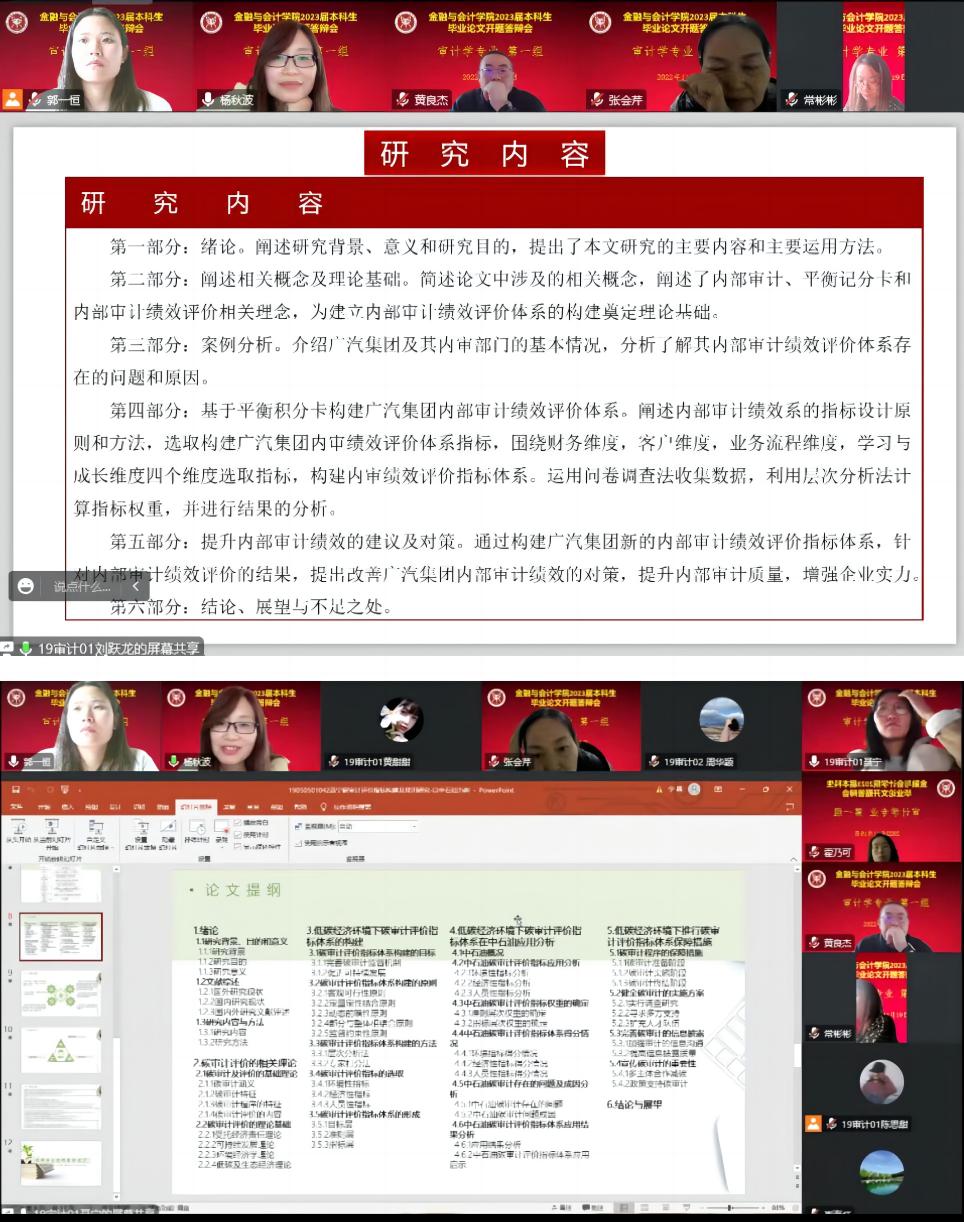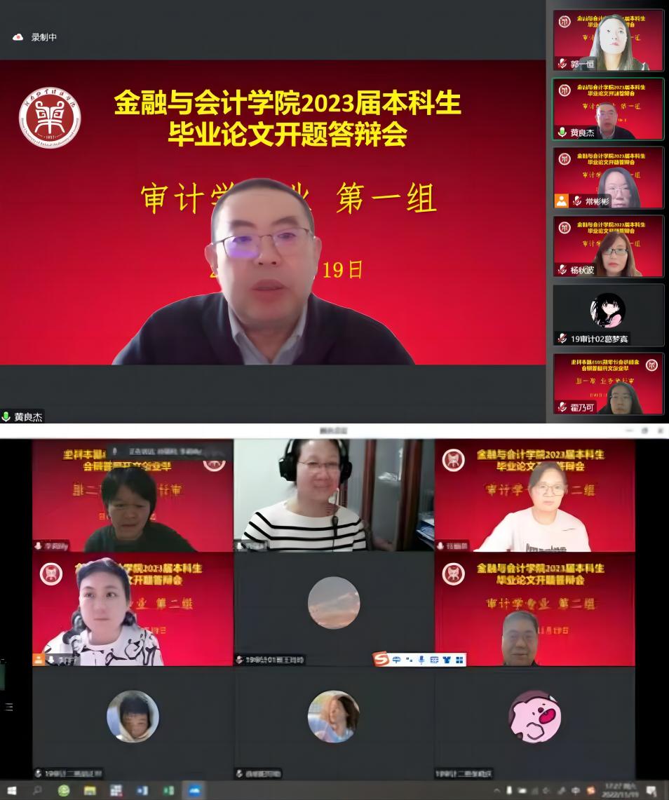 根据《河南牧业经济学院本科毕业论文(设计)工作条例》和《Beat365唯一官方网站2023届本科毕业论文工作实施方案》的要求,Beat365唯一官方网站2023届审计学专业本科毕业论文开题答辩于2022年11月19日8:00在英才校区举行,由于疫情的原因,答辩采取线上的形式举行,共分2个答辩小组,审计学专业118名同学参加了开题答辩。