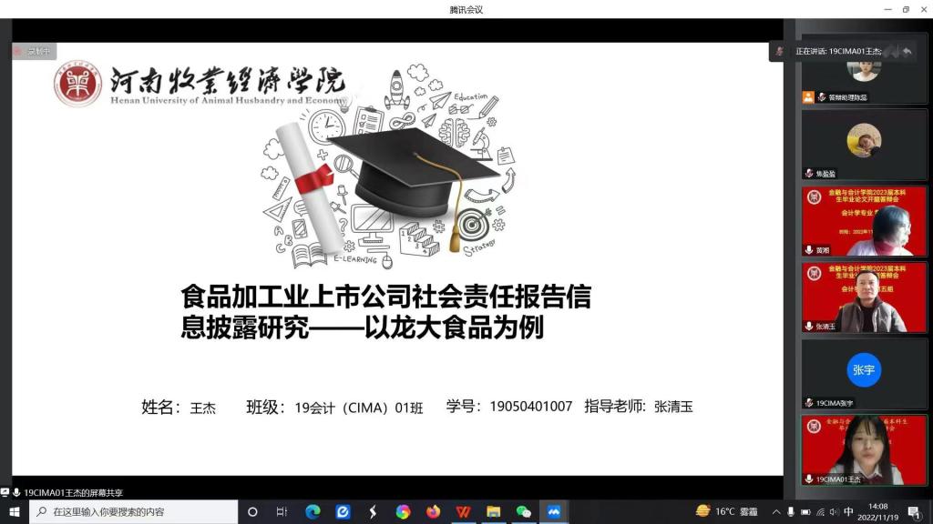 毕业论文工作是教学工作的重要组成部分,旨在对大学生综合实践能力和专业素养进行全面考核和综合检验。进行毕业论文开题答辩则是保证毕业论文工作顺利推进的重要环节。经过选题申报、师生互选、开题报告撰写等环节,2022年11月19日上午,Beat365唯一官方网站会计学专业346名同学分为5个小组同时进行了毕业论文开题答辩工作。由于疫情影响,本次采用线上形式进行了开题答辩。