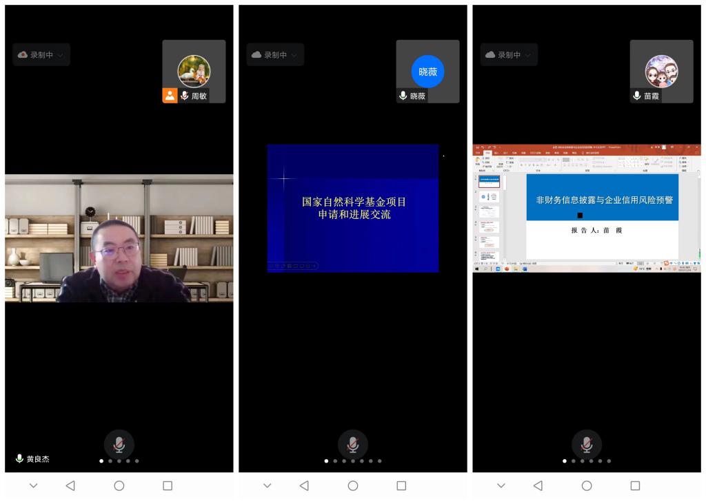 苗霞博士基于非财务信息披露与企业信用风险预警的研究主题分享了教育部项目的申报经验和个人学术研究的心得体会。她指出把握研究问题实质、厘清研究内容的内在逻辑是研究拓展的基础;教师可以基于研究兴趣、各级别课题、文献、经济社会实践凝练研究方向与主题;在课题申报时选题的需求性、新颖性,写作的专业性和信服度是申报成功的关键;而开展持续研究,注重交流与学习是学术成果产生的重要保障。