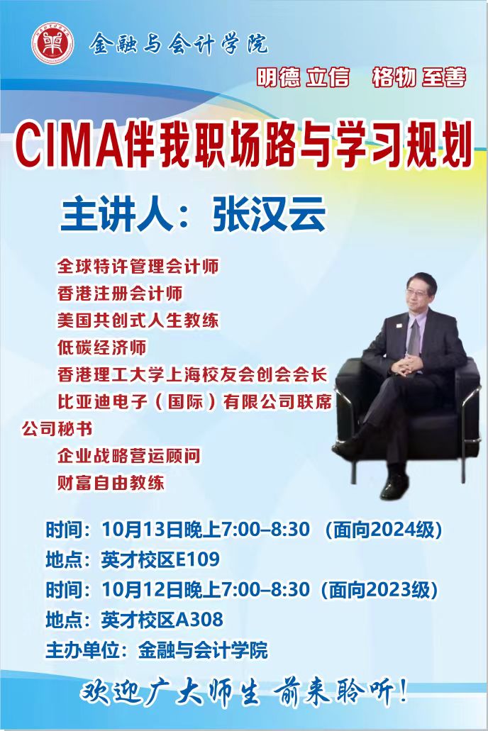 2024年10月12日,Beat365唯一官方网站邀请全国特许管理会计师,比亚迪电子(国际)有限公司联合公司秘书张汉云先生举行了“CIMA伴我职场路与学习规划”的讲座,此次讲座吸引了CIMA方向班在校大学生,旨在帮助学生们更好地了解管理会计领域的最新发展及职业规划。
