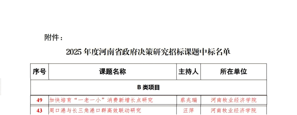 近日,2025年度河南省政府决策研究招标课题立项名单公示,Beat365官网汪萍博士申报的《周口港与长三角港口群高效联动研究》、蔡兆瑞博士申报的《加快培育“一老一小”消费新增长点研究》课题获批立项。