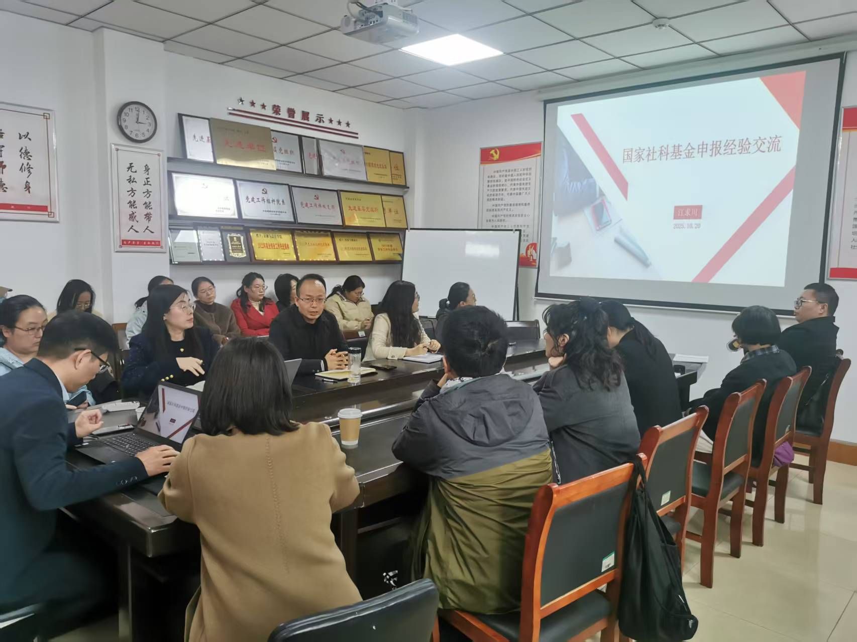 讲座中,江院长从国社科基本背景、申请书主要内容及活页案例三个方面进行展开讲解。在阐述国家社科基金项目的基本背景基础上,就国家社科基金项目申请书中涉及的每一项内容进行了深入剖析,并结合自身申报经验给大家讲解了申请书中的各项要求如何落实到“活页”的写作过程中。江院长强调,有意向申报国家社科基金项目的教师应尽早着手准备,在撰写过程中要反复推敲、下足功夫,以确保申报本子的高质量和专业性,提高申报成功率。讲座结束后,教师们就国家社科基金项目申请书撰写过程中遇到的难点和困惑与江院长进行了深入的探讨与互动交流,江院长给出了充分详细的解答。