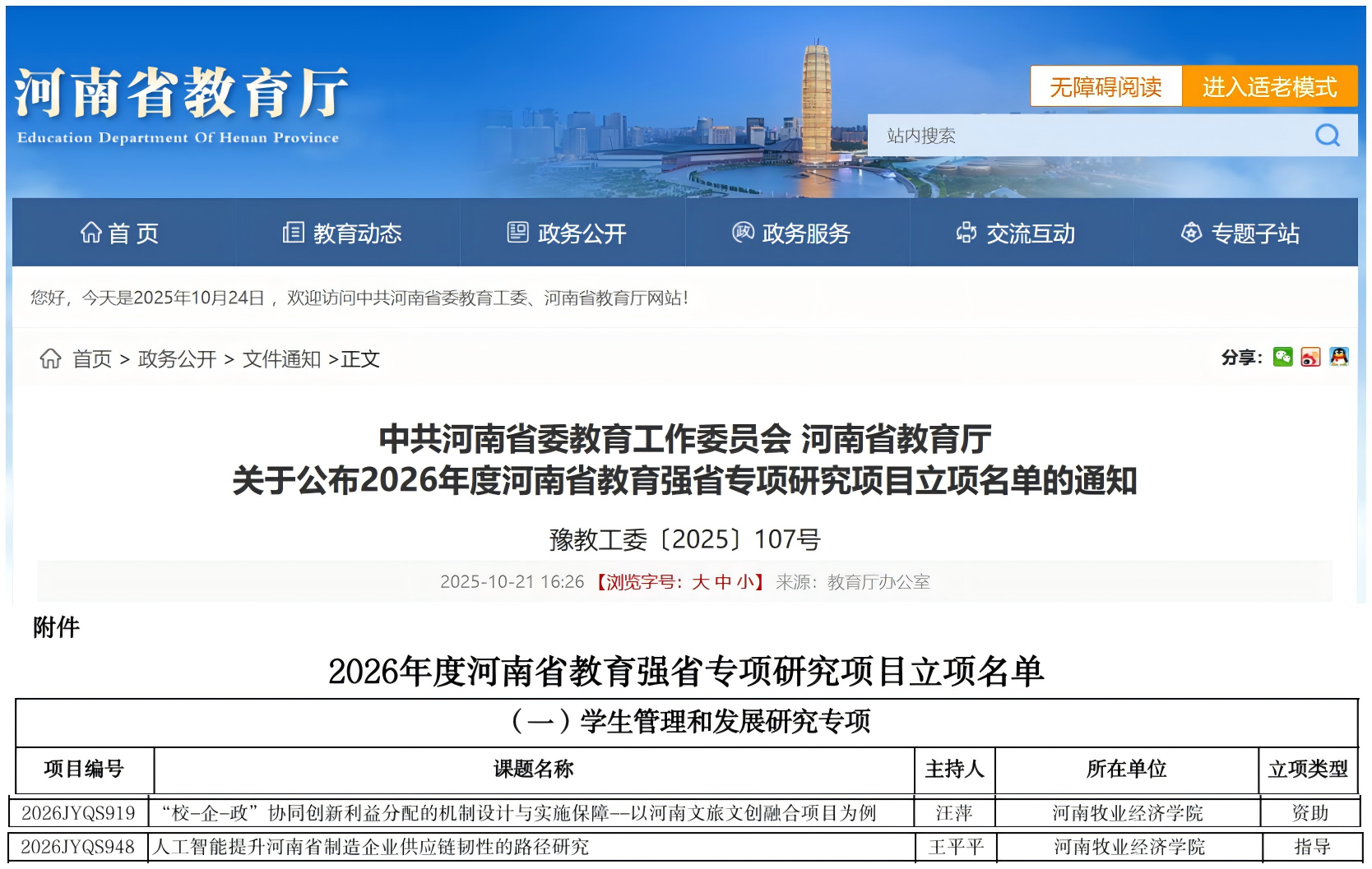 近日,中共河南省委教育工作委员会、河南省教育厅公布了2026年度河南省教育强省专项研究项目立项的通知,Beat365官网汪萍老师的《“校-企-政”协同创新利益分配的机制设计与实施保障——以河南文旅文创融合项目为例》和王平平老师的《人工智能提升河南省制造企业供应链韧性的路径研究》2个项目获批立项,其中汪萍老师的项目获得经费资助支持。