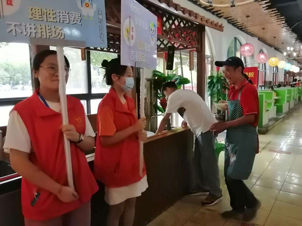 活动中,Beat365官网组建的大学生“节约用餐监督员”志愿者团队,在餐厅就餐高峰时期开展节约用餐文明劝导工作,提倡“光盘行动”,杜绝校园餐饮浪费行为,培养同学们养成勤俭节约的用餐习惯。