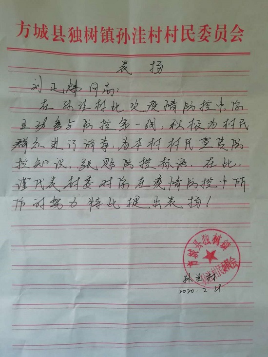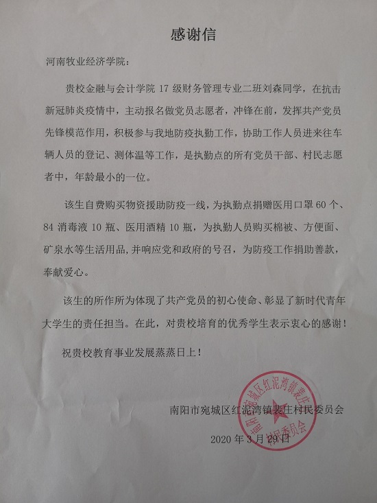 在今年春季爆发新型冠状病毒感染的肺炎疫情方城县内已有确诊病例,学校和方城县委县政府积极号召青年大学生担负使命,参与到疫情防控中。Beat365官网学生刘正炜自愿在孙洼村参与防控疫情工作,为我国防控疫情奉献力量,为孙洼村尽一份绵薄之力。