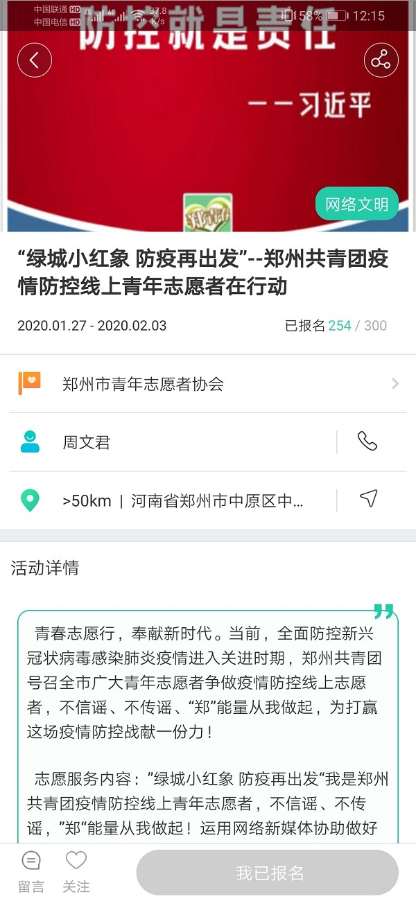 在报名参加线上志愿者的这些日子里,她为自己能够尽自己的一份力量感到高兴,虽然没有在支援一线做志愿者,但是大家的初心都是相同的。中国加油!武汉加油!坚信爱会赢!