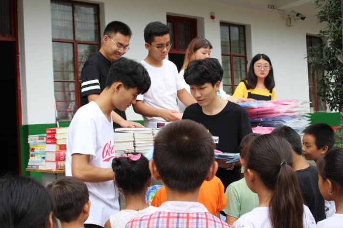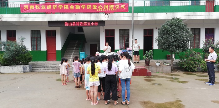 仪式上,背孜乡盐店村党支部书记潘改换代表盐店村向金融学院社会实践服务队的到来表示欢迎,对志愿者们服务乡村教育和关爱儿童表示感谢。随后,志愿者们向背孜乡第五小学的孩子们捐赠了百余册价值三千余元的书籍,和书包文具等学习用品。当看到受赠的孩子们洋溢着幸福的笑容时,志愿者们更加深切的感受到乡村的孩子更需要社会各界的关爱,孩子心灵的健康成长,是社会、家庭、学校的共同愿望。最后,校长段中岳代表小学全体师生,对志愿者们的捐赠表示感谢,并希望小学生们在受到捐赠的同时懂得感恩,努力学习、增长知识,用自己的成绩回报社会的关爱。