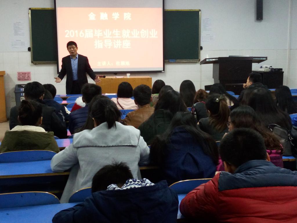 2015年11月20日下午,在E402,金融学院召开毕业生就业指导讲座,讲座邀请就业中心主任杜颖旭主讲,金融学院副书记贾宪军和毕业班辅导员老师出席本次活动。2013级全体毕业生聆听了本次讲座。讲座由贾宪军主持。
