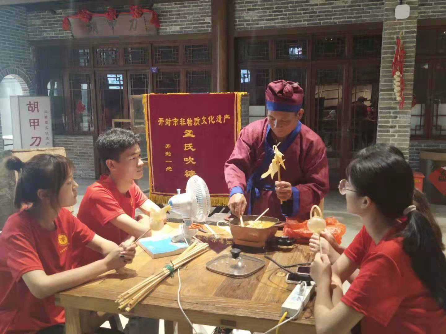 第二站,追光实践队有幸结识开封孟氏吹糖人——孟宪伟先生。吹糖人是一项极具有民俗特色的手艺,其拥有悠久的历史,被列入非遗文化。孟师傅向实践队员们详细介绍吹糖人所需工具并展示如何制作糖人。在孟师傅的巧手下,小块糖稀一眨眼间就变成了栩栩如生的小鸟、古灵精怪的猴子、翩翩起舞的蝴蝶……更弥足珍贵的是孟师傅在先辈的基础上继承,在当今时代不断融入现代元素进行创新,他把糖人手艺当作毕生事业,将糖人技艺与剪纸花艺、哨子等进行跨材质结合,制作出了“蛇吃鸟”等具有新颖趣味的作品,且一经推出广受好评。经过糖人画手艺,我们感受到孟师傅对传承记忆的思索,和与时俱进不断创新的思想。也为年轻人提供了更多关注和热爱非遗的理由。爱非遗技艺,也爱为技艺薪火相传的匠人和匠心。