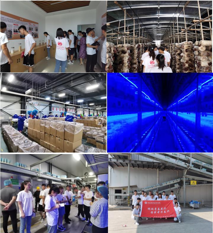 探访菌菇基地结束后,队员们前往了星河生物科技有限公司。在星河生物科技有限公司张主管的带领下,队员们了解到公司主要生产、包装和出售金针菇,每天约有26吨金针菇被运往全国各地,主要销往北京、上海等一线城市,年产量可达3亿左右。在星河生物科技有限公司的产品产销处,成员们细心地观察到厂内拥有着齐全的设施装备、专业的流水线以及精心培育的冷库。透过冷库,紫色的光照、阴暗的环境,望不到边的架子里一簇簇白玉般温润的金针菇正在安静地生长。通过高科技严格控制光照、温度及湿度,实时监控和远程调控每一株金针菇的生长状况,为金针菇提供了良好的生长环境。金针菇在成熟后,经过包装加工,装箱运输,很快被供应至祖国的大江南北。在中国共产党的领导下,冀屯镇一改贫穷落后的面貌,一跃成为中国食用菌最大生产基地。在时代的洪流中,在崭新的征程里,我们青年学子更应秉持一颗炽热的初心,投身基层工作,为“乡村振兴”贡献自己的青春力量,不辜负党和人民的殷切期望。