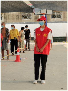 疫情再次席卷而来,作为一名团员,势必应该为本次疫情贡献自己的一份力量。她积极参加社区党支部组织的疫情防控工作,在小区门口执勤,对来往人员进行登记,拦截外地车辆禁止通过本小区,并且测量体温,为居民讲解防疫的重要性。