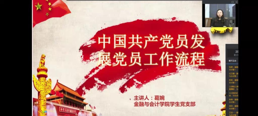 葛老师首先向21级的新生们表示热烈的欢迎,接着葛老师向大家详细介绍了党员发展流程,主要包括:申请入党、入党积极分子的确定和培养教育、发展对象的确定和考察、预备党员的接收、预备党员的教育考察和转正五个环节。葛老师依据党章并结合实际,用通俗易懂的语言向同学们一一阐述了入党具体流程以及各个环节的发展细节,并与新生们进行线上互动,耐心的解答了21级新生对入党流程的种种疑问,让大家对党员发展的流程以及各项制度更加了解。将入学教育与党性教育相结合,向新生传播关于党的知识、培养新生党性、提高思想觉悟,对大一新生树立正确的价值观念起到指引作用。最后,葛老师希望同学们都能努力提高自己的思想素质、始终坚定理想信念、不忘初心、努力学习、积极向党组织靠拢。