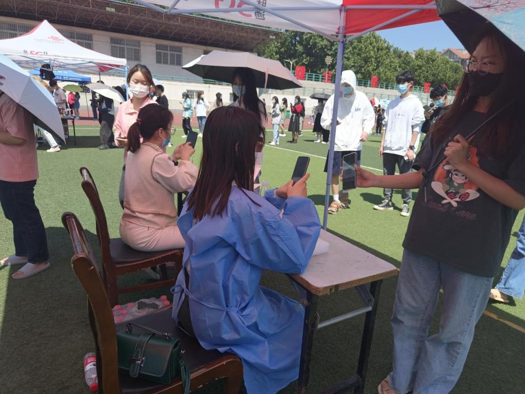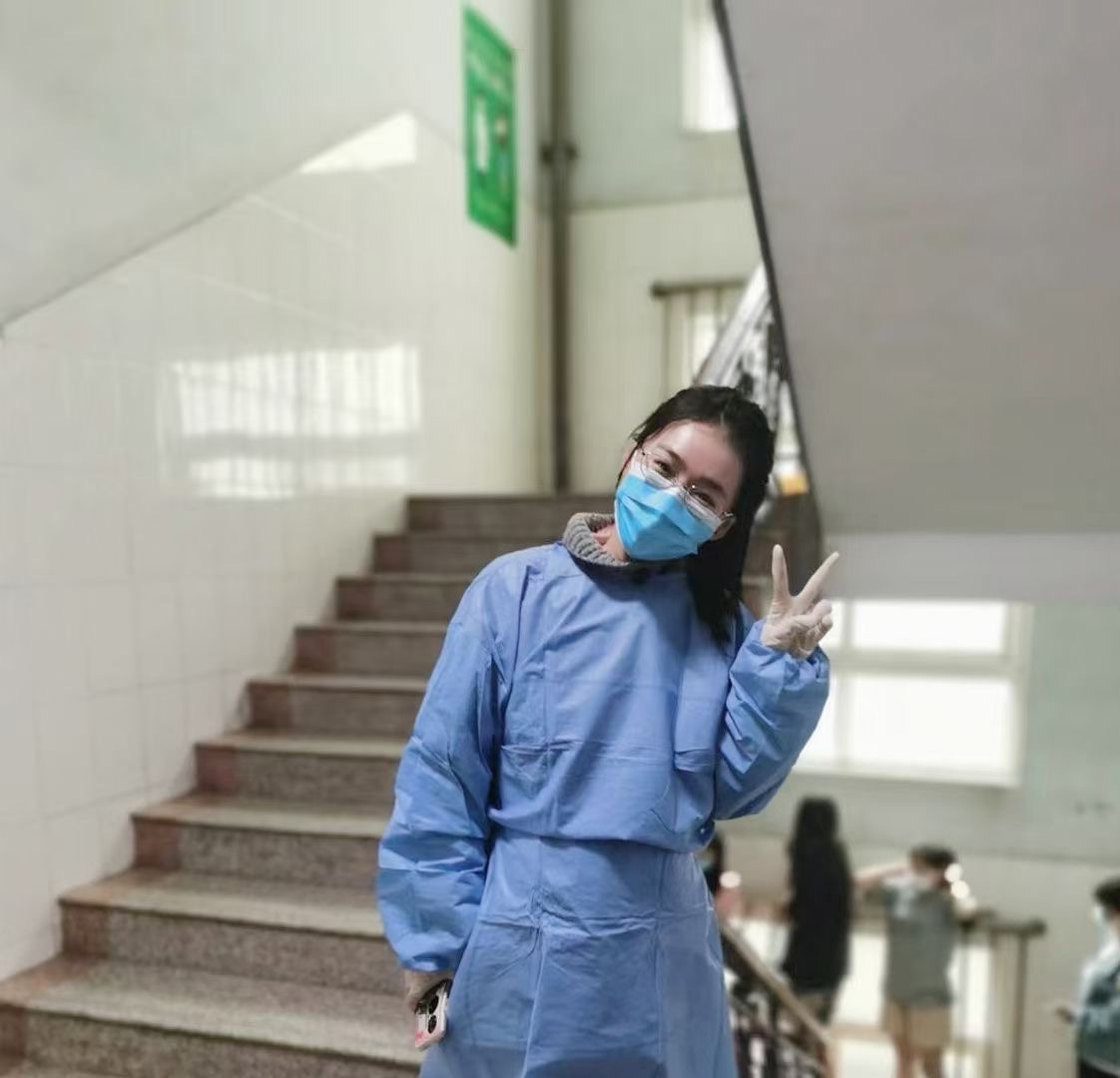 不仅如此,在9号楼里,还要组织学生有序的进行核酸检测,待所有学生检测完毕,汗水早已浸湿了头发,卸下自己的盔甲,与同事相视一笑,为彼此扫码,测核酸。